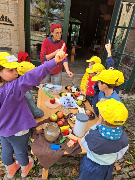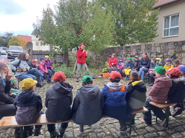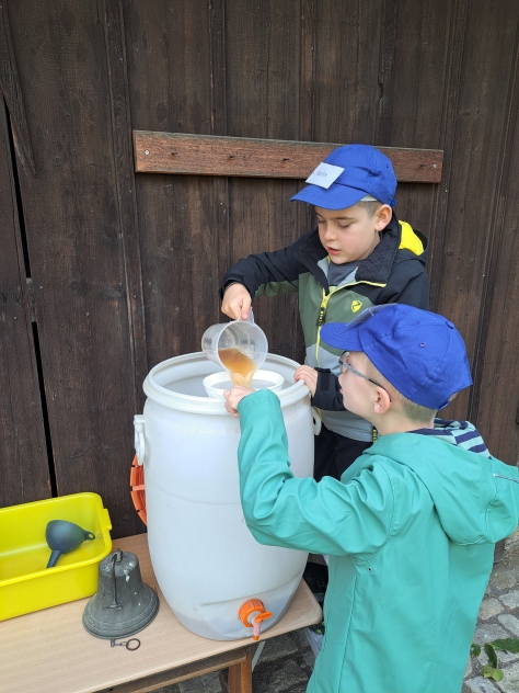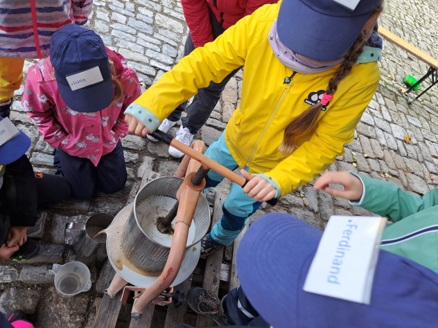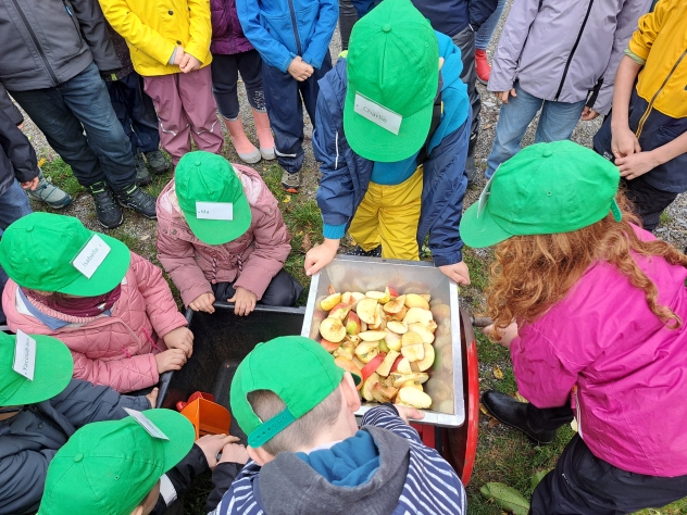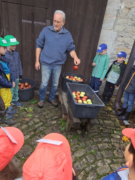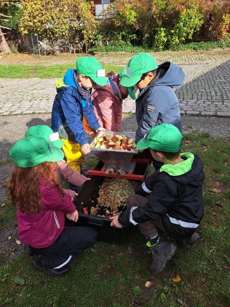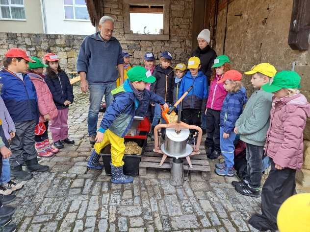 Die Klasse 2a besuchte im Oktober den Pabst-Hof in Giebelstadt. Hier wollten wir den Apfel genauer unter die Lupe nehmen. Nachdem wir schon einiges über Obst – und im Speziellen über den Apfel – in der Schule gelernt hatten, wollten wir nun von Fachleuten praktisches Wissen vermittelt bekommen. Das Ehepaar Pabst betreibt einen landwirtschaftlichen Betrieb und bringt Kindern im erlebnispädagogischen Sinn die Natur und die gesunde Ernährung näher. Zu Beginn unseres Erlebnis-Schultages pflückten wir erst mit Frau Pabst Äpfel und schauten uns diese noch einmal genau an. Dabei war wichtig, dass, auch wenn ein Apfel nicht gleichmäßig rund und makellos ist, er trotzdem lecker ist und gegessen werden kann. Frau Pabst erklärte auf spannende Art, wie sich ein Apfel über das Jahr hinweg entwickelt und vermehrt werden kann. Dann wurden vom Ehepaar Pabst wichtige Hinweise zu den bevorstehenden Workshops gegeben, in denen die Kinder eigenen Apfelsaft herstellen sollten. Es gab vier Stationen, an denen die Schüler arbeiten durften. Diese wurden nach einer gewissen Zeit durchgewechselt, so dass jedes Kind alle Workshops durchlaufen konnte. Der Weg zum selbst gepressten Apfelsaft bedurfte einiger Schritte. So sortierte die erste Gruppe Äpfel, wusch sie und schnitt sie in Achtel. Gruppe 2 füllte die Apfelschnitze dann in einen „Muser“, in dem die groben Stücke mit einer Art großen Raspel, die durch eine Drehkurbel bewegt wurde, weiter zerkleinert wurden. Dieser „Apfelmatsch“ wurde schließlich der dritten Gruppe übergeben, die ihn in das Sieb einer Handpresse einfüllte. Dort wurde mit einem Gewinde eine Platte auf das Sieb gedrückt, so dass die Kinder den Apfelsaft herausfließen sehen konnten. Dieser wurde dann in Kannen aufgefangen und in einen Kanister gefüllt. Die vierte Station hatte die „gesunde Ernährung“ zum Thema. Hier erarbeitete Frau Pabst mit den Kindern eindrücklich, warum Äpfel gesund für uns sind und erklärte anschaulich, was Nährstoffe, Vitamine und Ballaststoffe sind und wofür diese gut sind. Die Klasse 2a hatte so viel Spaß an den Stationen und beim Apfelsaftherstellen, dass sie gar nicht aufhören wollte. Alle Kinder arbeiteten so fleißig, dass sich zum Schluss jedes Kind eine Flasche mit dem selbstgepressten Saft abfüllen konnte. Als Abschlusshighlight durften wir mit Herrn Pabst die trockenen, gepressten Apfelstückchen zu den hauseigenen Ziegen bringen, für die diese eine Delikatesse waren. So erfuhren wir auch, dass bei unserer Apfelsaftherstellung keine Abfallprodukte entstanden, sondern alles verwertet werden konnte. Insgesamt waren sich Schüler, Lehrer und Elternbegleiter einig: Dies war ein ganz besonderer Schultag mit tollen Erfahrungen, der allen viel Spaß gemacht hat, und außerdem haben wir den leckersten Apfelsaft der Welt hergestellt.