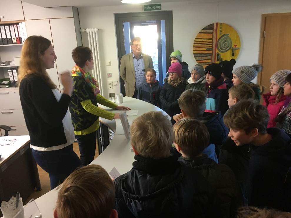 Am Mittwoch, den 5.2.2020 durfte die Klasse 4b aus Waldbrunn das Rathaus und unseren Bürgermeister, Herrn Fiederling, besuchen. Nachdem im Unterricht ausführlich über das Thema Gemeinde und Wahlen gesprochen worden war, war es richtig spannend, die letzten Fragen vor Ort zu klären. Wir wurden sehr freundlich von Frau Kreß und Frau Döll empfangen, die uns ganz viel zum Bürgerbüro / Einwohnermelde- und Passamt / Fundbüro erzählt haben. Anschließend ging es zum Bauamt, Finanzverwaltung, Geschäftsleitung/Kämmerei und ins Vorzimmer des Bürgermeisters, wo wir auch sehr ausführlich über alles Wichtige informiert wurden.