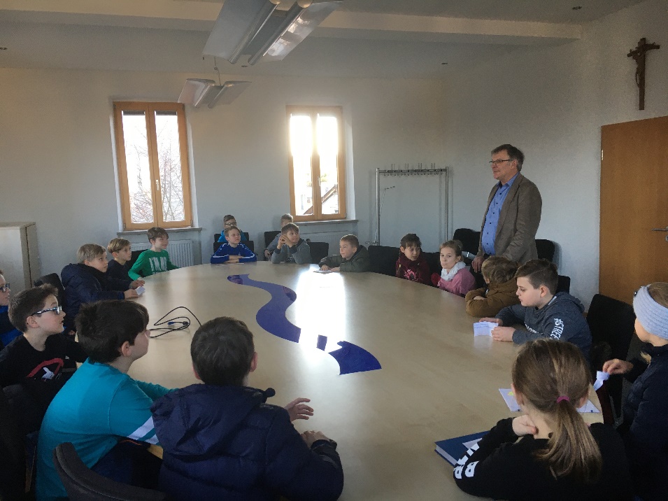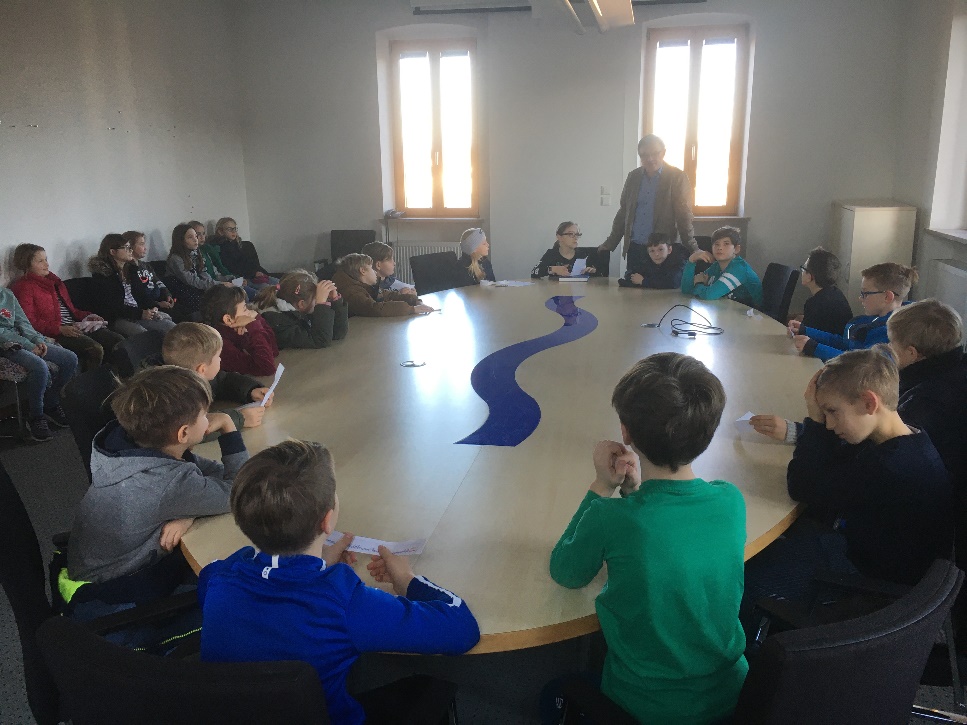 Zum Schluss durften wir am großen Tisch des Gemeinderates Platz nehmen. Wir hörten den Ausführungen von Herrn Fiederling aufmerksam zu und hatten auch eine Menge Fragen an ihn.