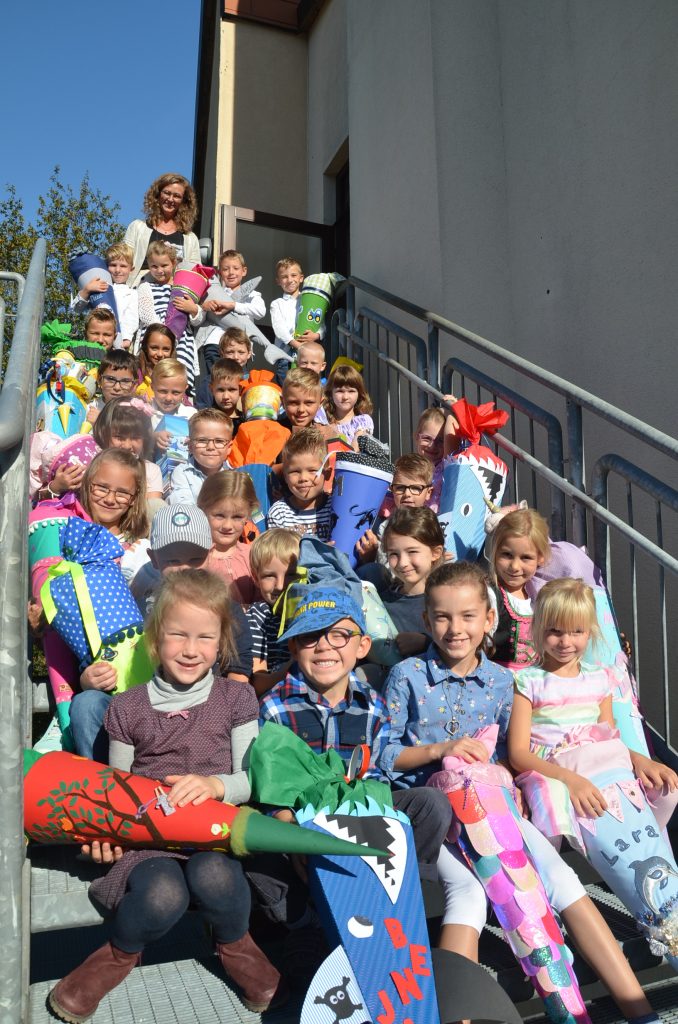 Schon fast vier Wochen sind wir Erstklässler nun in der Schule. Wir haben schon sehr viel gelernt und uns gut eingewöhnt. Neben einem Wandertag, bei dem wir uns eine Keksmedaille verdient haben, weil wir so tüchtig gelaufen sind, haben wir den ersten Feueralarm geprobt und unsere Pausenzone ist auch schon erkundet. Die Regeln einzuhalten fällt uns gar nicht so schwer, da wir schon einiges aus dem Kindergarten kennen. Wenn wir die Klangschale hören, sitzen wir blitzschnell mit verschränkten Armen („Kommando Brezel“) und mucksmäuschenstill da und passen besonders gut auf. Gerade beim Erklären der Hausaufgaben ist das wichtig. Ganz wie die Großen schreiben wir sie schon in ein Heft auf. Die Dokumentenkamera hilft uns sehr dabei, uns zurecht zu finden; gerade auch bei Hefteinträgen.