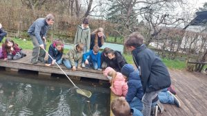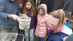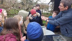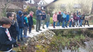 Am letzten Tag vor den Osterferien gab es Krötenalarm! Gespannt durften die Kinder der Klassen 3b, 3c und 4b nacheinander die Gartenteiche von Frau Hench und Frau Metzger besuchen. Dort gab es für ruhige Beobachterinnen und Beobachter viel zu entdecken. Herr Dr. Mahsberg erzählte vom Leben der Frösche, Kröten, Molche, Wasserläufer…u.s.w und zeigte die Tiere in Modellen und lebendig aus der Nähe. Außerdem beantwortete er geduldig die vielen Fragen der wissbegierigen Kinder.