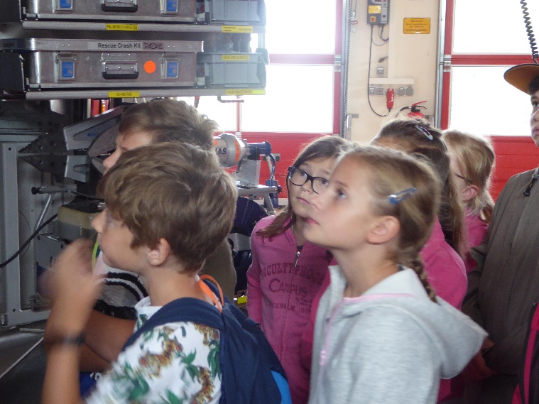 Es gab viel zu staunen, als die verschiedenen Fahrzeuge vorgestellt wurden. Am Ende unseres Besuchs bei der Feuerwehr waren sich einige Kinder sicher, auch einmal bei der Feuerwehr dabei sein zu wollen. Das Allerbeste kam zum Schluss! Die ganze Klasse wurde aufgeteilt auf die drei Feuerwehr – Fahrzeuge zum Schulhaus zurückgefahren! Herzlichen Dank für diesen interessanten Vormittag bei der Freiweilligen Feuerwehr Waldbrunn!